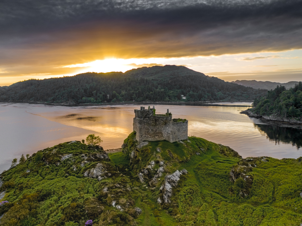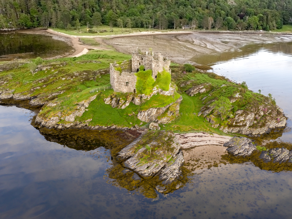 Tioram Castle is a ruined castle on Eilean Tioram Island, accessible at low tide, in the Loch Moidart of the Lochaber district of the Scottish Highland Administrative Area. It is located west of Acharacle's village and 80 kilometers from Fort William, the largest town in the Highlands. It controls access to Loch Shiel.