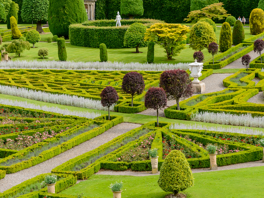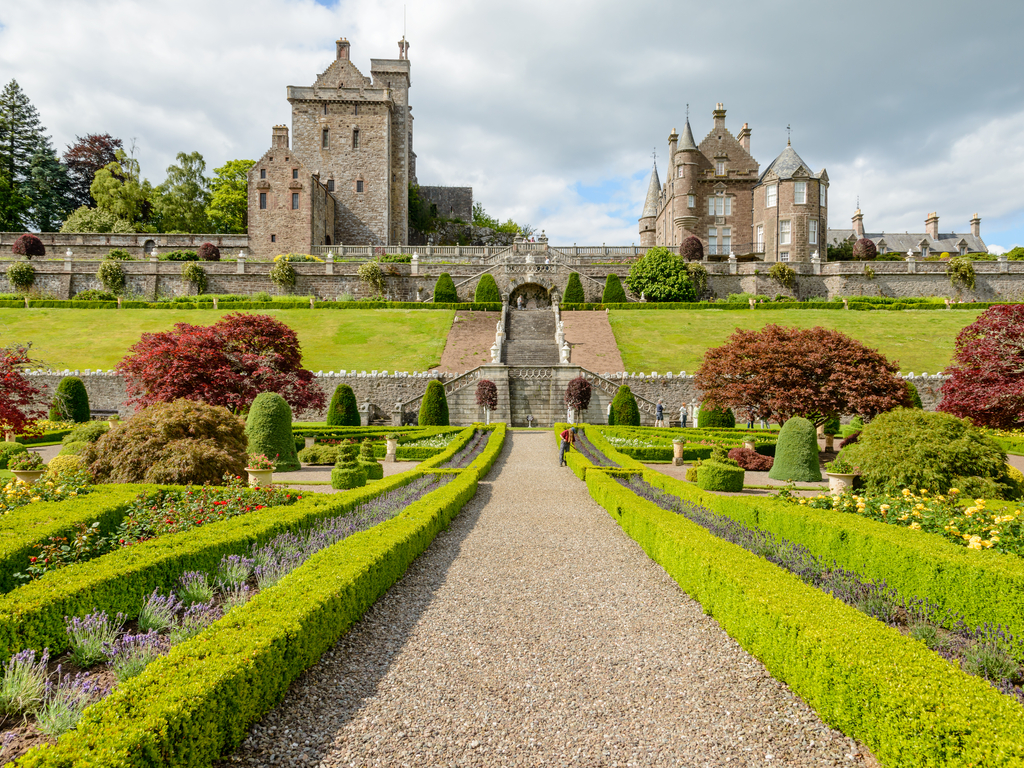 The castle is on a prominent rocky spine known as Gask Ridge, a geographical feature that extends for several miles across Perthshire. The tower house, or keep, is no longer used as a residence. Standing between the tower house and the edge of the ridge, it was originally meant to control access to the courtyard behind it, which offers a beautiful view of the formal gardens. The French gardens are situated to the south of the castle, on its rocky outcrop.